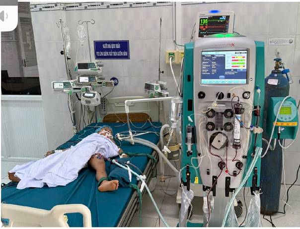 Hình ảnh cháu bé 4 tuổi đang được lọc máu liên tục vì sốc phản vệ độ III sau khi bị ong vò vẽ đốt nhiều nhát - Nguồn internet