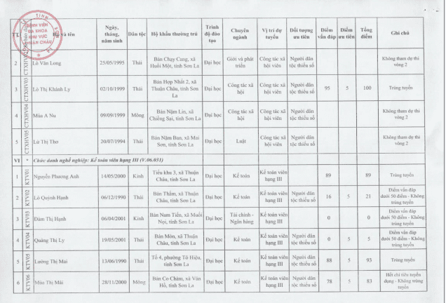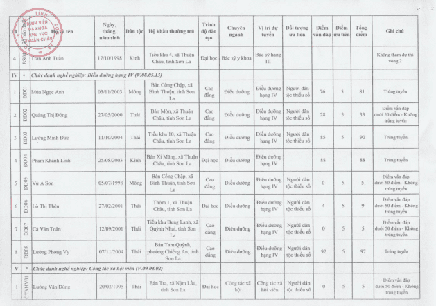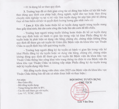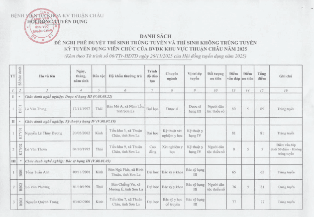 Thông báo danh sách thí sinh đủ điều kiện, không đủ điều kiện tham dự vòng 2 (vấn đáp) kỳ tuyển dụng viên chức bệnh viện đa khoa khu vực Thuận Châu năm 2025