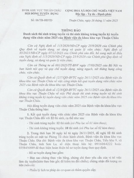 Thứ 5, 27/11/2025 | 14:13 A- A A+ | Thông báo danh sách thí sinh trúng tuyển và thí sinh không trúng tuyển kỳ tuyển dụng viên chức năm 2025 của bệnh viện đa khoa khu vực Thuận Châu Đọc bài Lưu 06 TUYỂN DỤNG.pdf Tổng số điểm của bài viết là: 0 trong 0 đánh giá Click để đánh giá bài viết