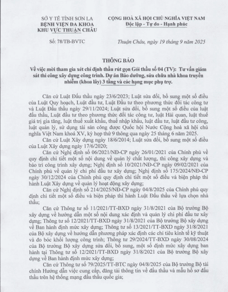 Thứ 6, 19/09/2025 | 15:00 A- A A+ | Thông báo về việc tham gia xét chỉ định gói thầu 04(TV):tư vấn giám sát thi công xây dựng công trình.Duwjj án bảo dưỡng sửa chữa nhà khoa truyền nhiễm 03 tầng và các hạng mục phụ trợ Đọc bài Lưu thông báo 78.pdf Tổng số điểm của bài viết là: 0 trong 0 đánh giá Click để đánh giá bài viết